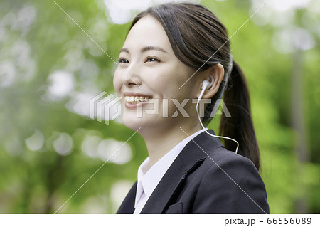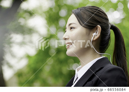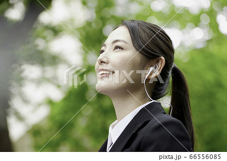 通勤時にブルートゥースイヤホンで音楽を聴く若いビジネスウーマン