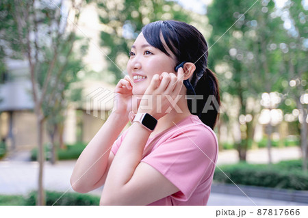 骨伝導イヤホンで音楽を楽しむスポーツウェアの女性