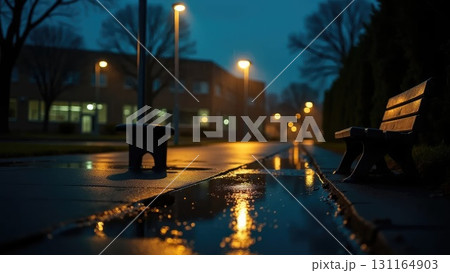 Night Rain Schoolyard with Lamp Reflections in Puddles and Lonely Bench