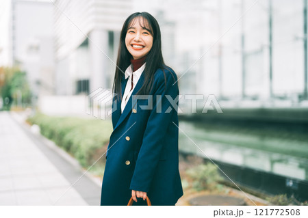 アクションポーズ ジャンプするビジネスマン ブレ 後姿 ガッツポーズ 新宿高層ビル街