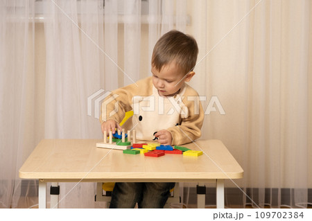 A two-year-old boy plays with wooden toys to develop logic and motor skills