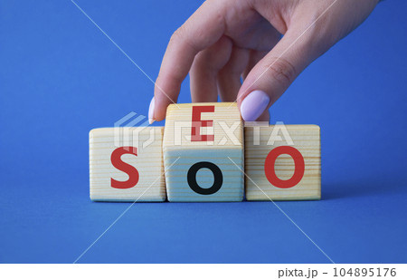 SEO vs SOO symbol. Businessman hand turns wooden cubes and changes the word SOO to SEO. Beautiful blue background. SEO vs SOO and business concept. Copy space