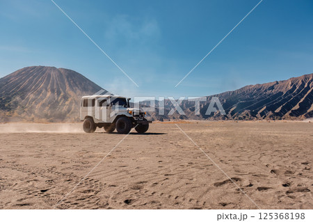 Off road vehicle parked by the Volcanic Mount Bromo on desert wilderness at Indonesia