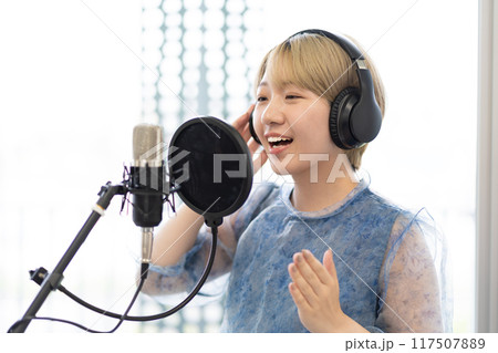 歌を歌う金髪ショートヘアの若い女性(コンデンサーマイク、録音、ボーカル、ナレーター)