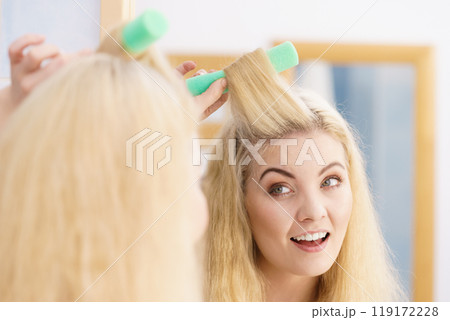 Close-up portrait of curly Caucasian woman with multi-colored hair. Model for hairstyles