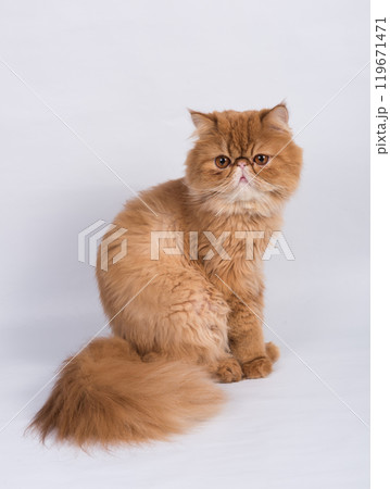 Persian Exotic Longhair cat is on white background. The cat raised his paw up