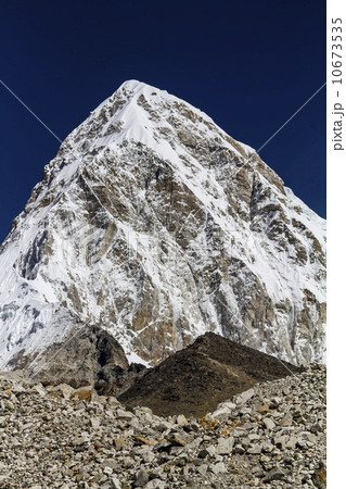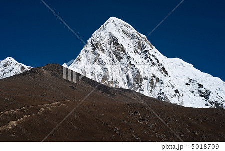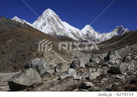 ゴラクシェプより雪のプモリ(7161m)と岩のカラパタール(5545m)の丘を望む