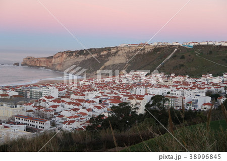 ポルトガル、ナザレ、ペデルネイラ地区よりプライア地区と大西洋を眺望、朝焼け、