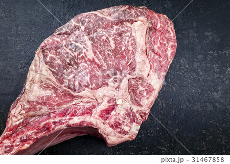 Piece of raw rib eye tomahawk or cowboy steak, raw fresh marbled prime beef, on white stone background, top view flat lay, with copy space for text