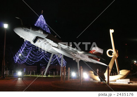 米海軍厚木航空基地日米友好広場に展示されているEA-6Bプラウラー電子戦攻撃機とクリスマスツリーイルミネーションの夜景