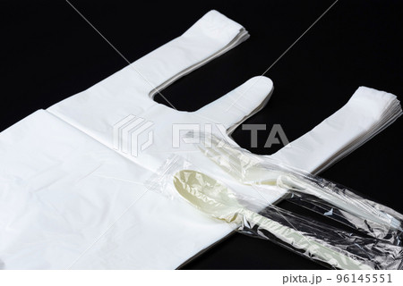 レジ袋とプラスチックスプーンとプラスチックフォーク(使い捨てプラスチック製品のイメージ)