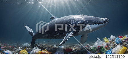Whale in its natural habitat surrounded by man-made waste and plastic waste, pollution of the oceans and damage and destruction of ecosystems