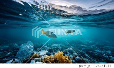 Plastic trash in the ocean. Environmental pollution. sea is covered in plastic and dead sea creatures. global problem, threat ocean wildlife and calling for urgent action to protect the environment.