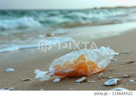 a plastic packaging, in the beach coast, pollution, garbage.