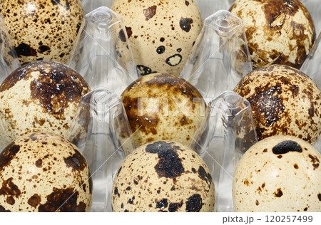 Raw quail eggs in plastic packaging