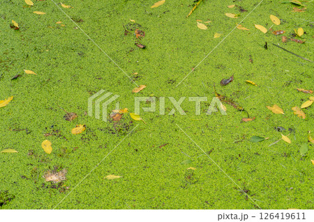 Exploring tranquil nature scene with floating leaves in serene pond environment