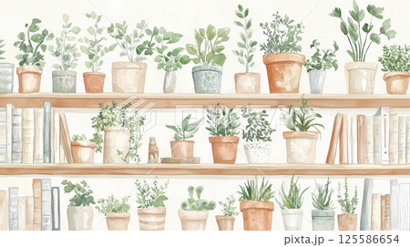 Eco-friendly watercolor illustration of wooden bookshelf adorned with green houseplants for natural home decor inspiration