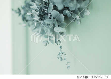 緑のドアに飾られユーカリのリース