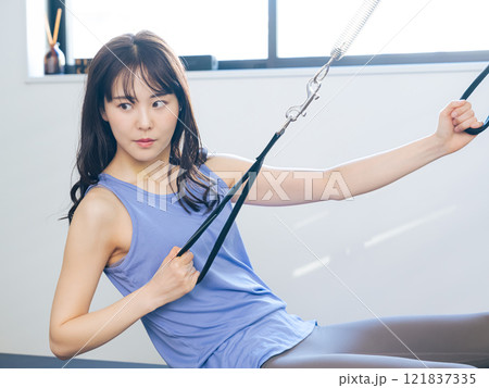 マシンピラティスのトレーニングをする女性