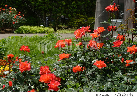 神代植物公園の鮮やかな朱色の薔薇の花・プリンセス・ミチコ