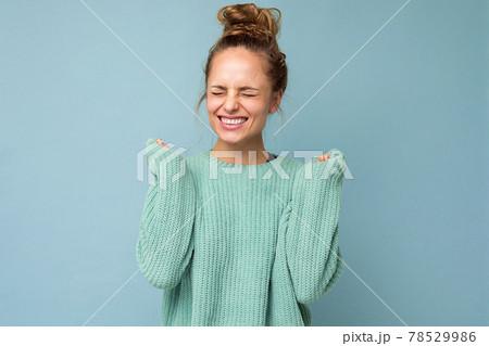 Young happy positive emotional attractive blonde woman with sincere emotions wearing casual blue