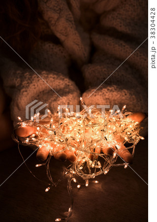 Magic hot light from lanterns falls on the woman eyes. The naked adult sexy caucasian girl lies at night on the bed and holds warm lamps in her hands.