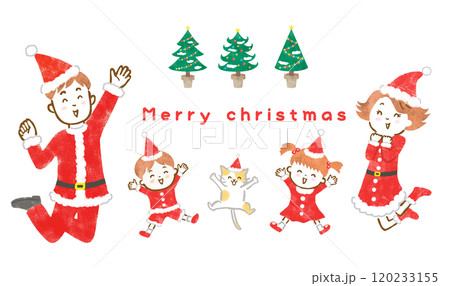 サンタの衣装を着てジャンプする家族とクリスマスツリーのイラスト