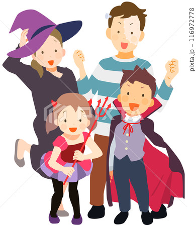 カジュアルで軽めのハロウィンコスプレをした家族のイラストセット
