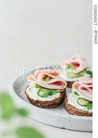 Bruschetta with baguette, bacon or meat, cream cheese, oregano and fresh cucumber