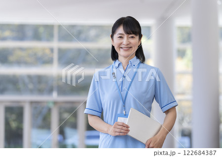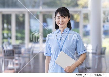 タブレットを持ったブルーのポロシャツを着たカメラ目線の50代の女性 施設スタッフ イメージ