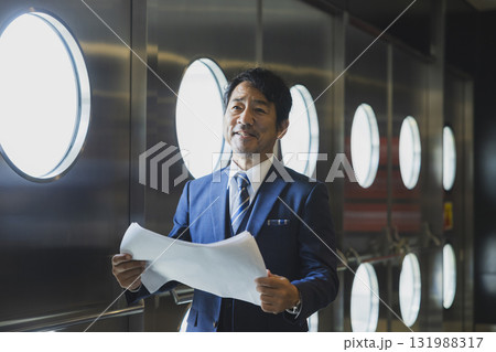 イベントを仕切るスーツのミドル男性