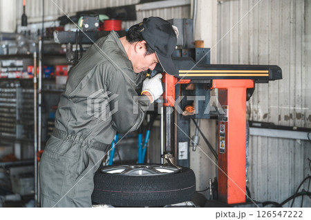 タイヤチェンジャーを使いタイヤの組み替えをするメカニック・整備士の男性作業員