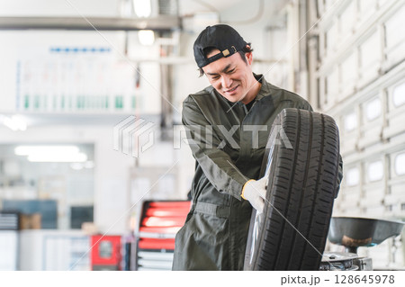 自動車整備工場でタイヤを運ぶ男性メカニック(肉体労働・重労働・重い・腰痛)
