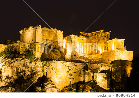 ギリシャ アテネのアレオパゴスの丘から見える夜になってライトアップされたアクロポリスとパルテノン神殿