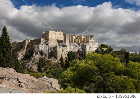 View to Acropolis with Propylaea and Temple of Athena Nike, Athens, Greece