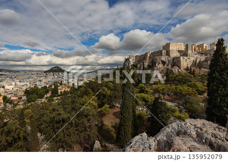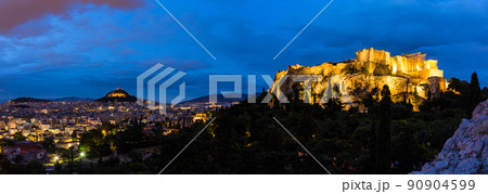 ギリシャ アテネのアレオパゴスの丘から見える夜景とライトアップされたアクロポリスとパルテノン神殿