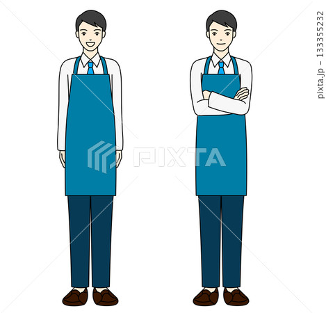 青いエプロンを着て腕組みと直立をする男性店員の全身イラスト