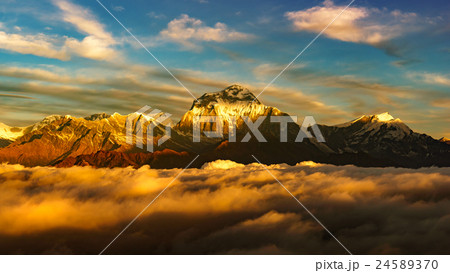 南アジアのネパール ヒマラヤ山脈眺望の名所プーンヒル展望台から夜明けのアンナプルナサウスの山頂