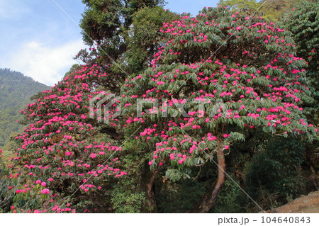 南アジアのネパール ヒマラヤ山脈のアンナプルナトレッキングコース沿いのシャクナゲ