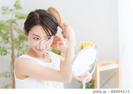 ヘアケアをする女性・髪の毛をブラッシングする女性