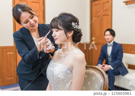 ブライズルーム・控え室で結婚式・披露宴の準備をする花嫁・新婦(メイク・アイシャドウ)