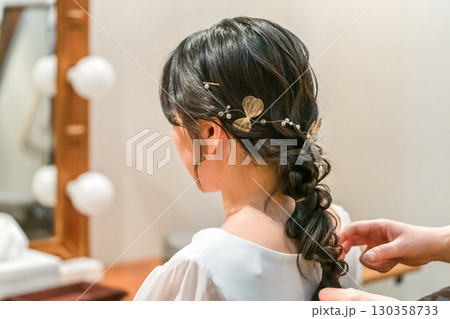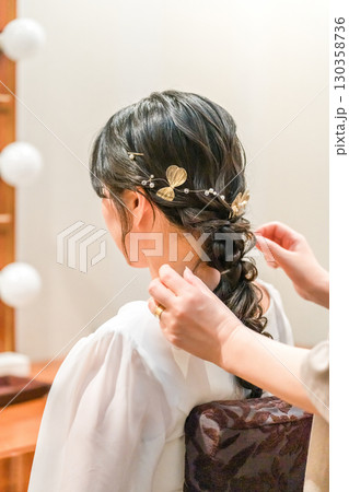 ブライズルーム・控え室で結婚式・披露宴の準備をする花嫁・新婦(ヘアメイク,ヘアセット)