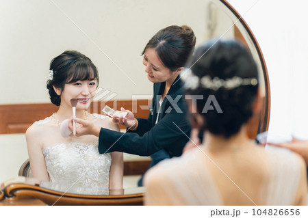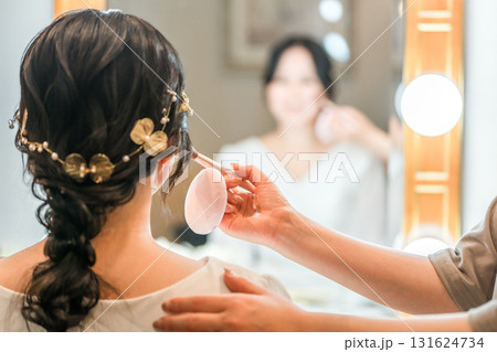結婚式場のブライズルームでメイクをする花嫁,新婦