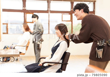 美容院でヘアセットしてもらう女性 若い美容師