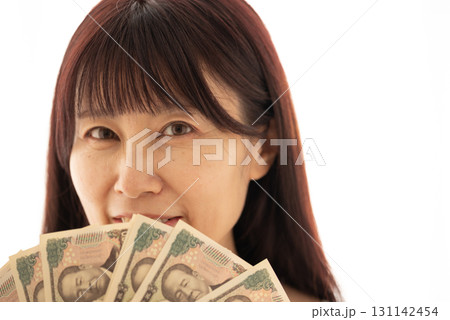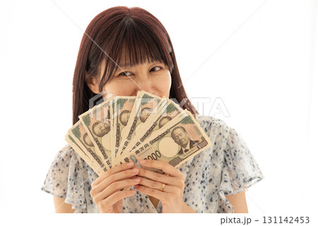 新札札束(渋沢栄一)を団扇(扇子)代わりにする女性