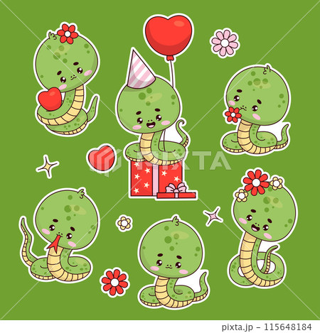 Cute snake. Sticker collection. Funny reptile kawaii character. Vector illustration with cartoon holiday serpent. Kids collection.
