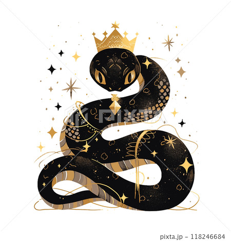 2025 black snake with a crown on its head. The snake is black and gold. The crown is gold
