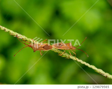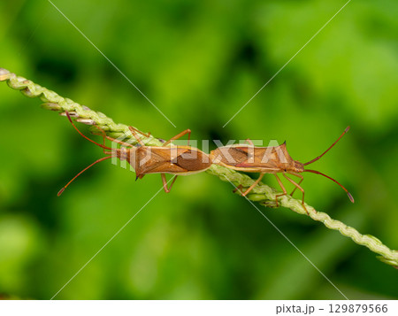 細い草にいる連結したホソハリカメムシ