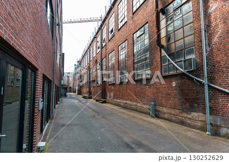 Old red brick factory building with large windows
