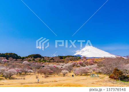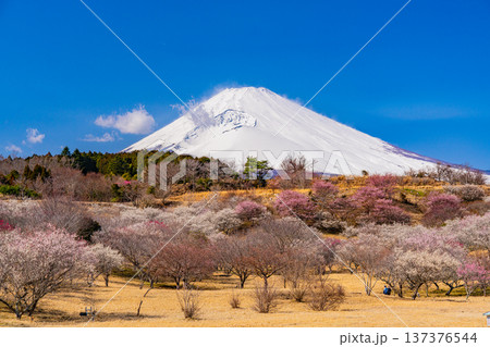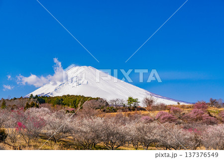(静岡県)裾野市梅の里 満開の紅白梅 新雪富士